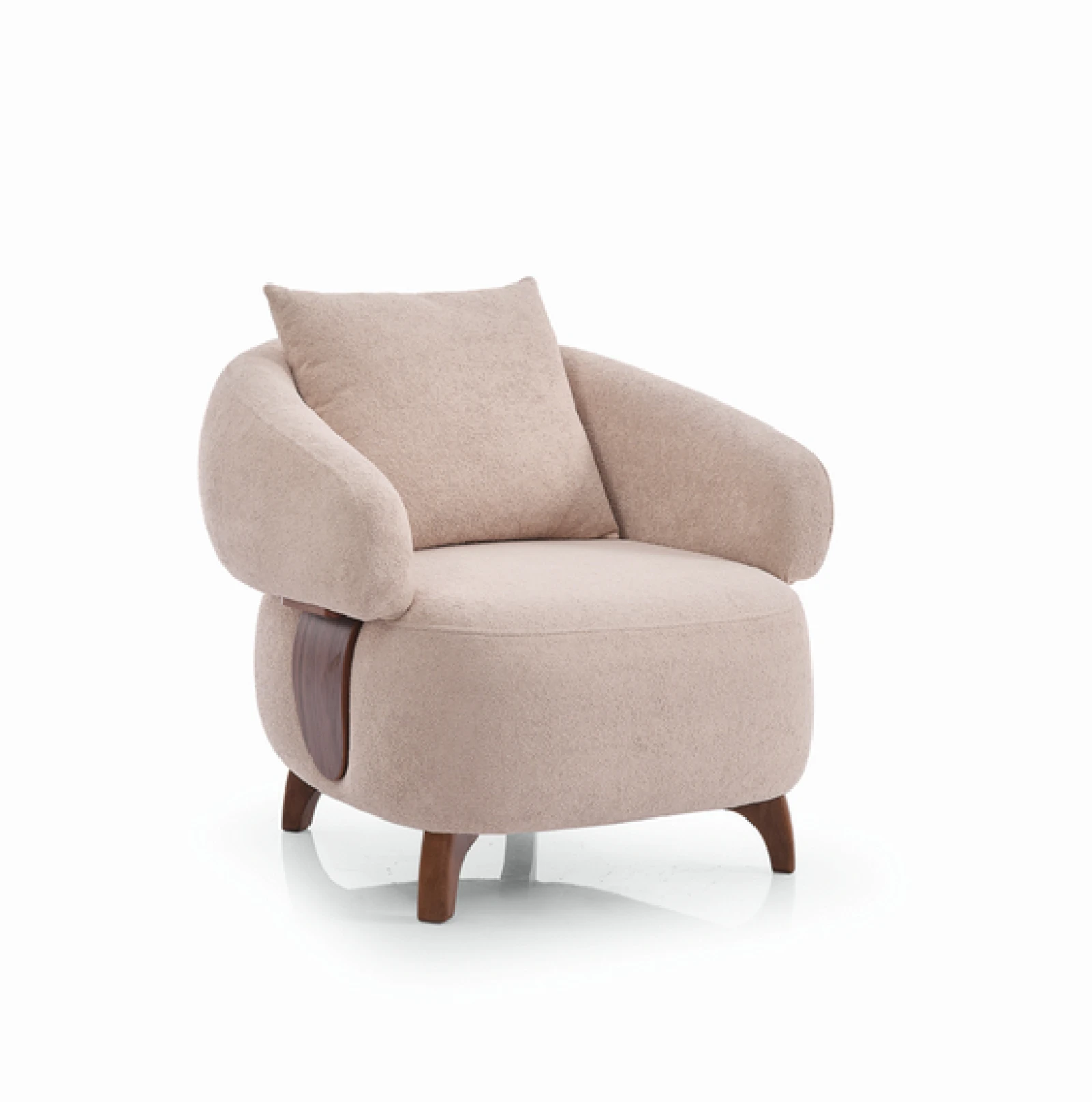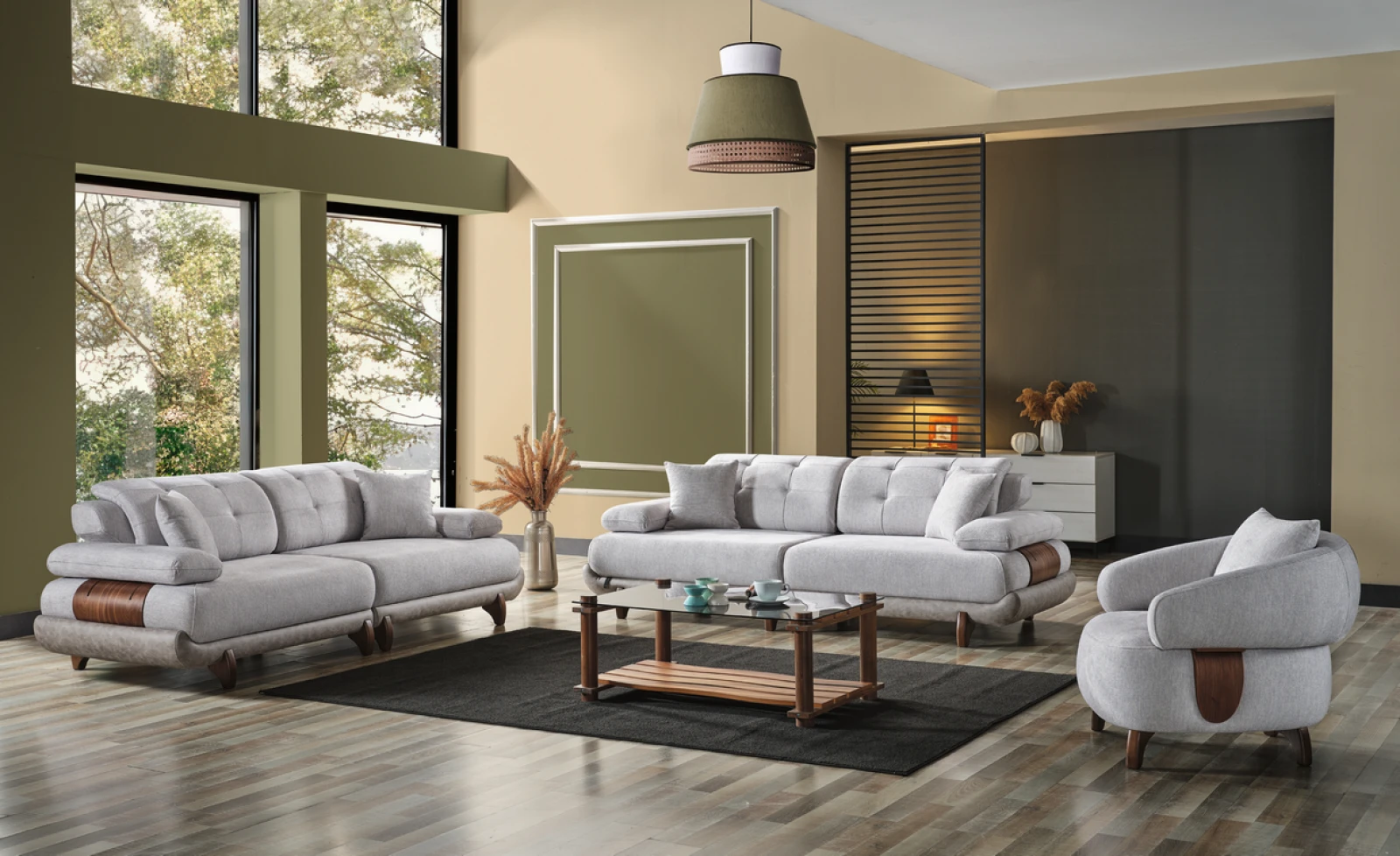Yumuşak dokulu açık renk kumaşı, doğal ahşap detayları ve yuvarlatılmış hatlarıyla Alexa koltuk takımı yaşam alanına sakin bir şıklık getirir. Geniş oturum alanları sayesinde uzun sohbetler, kısa kestirmeler ve keyifli anlar için tasarlandı.